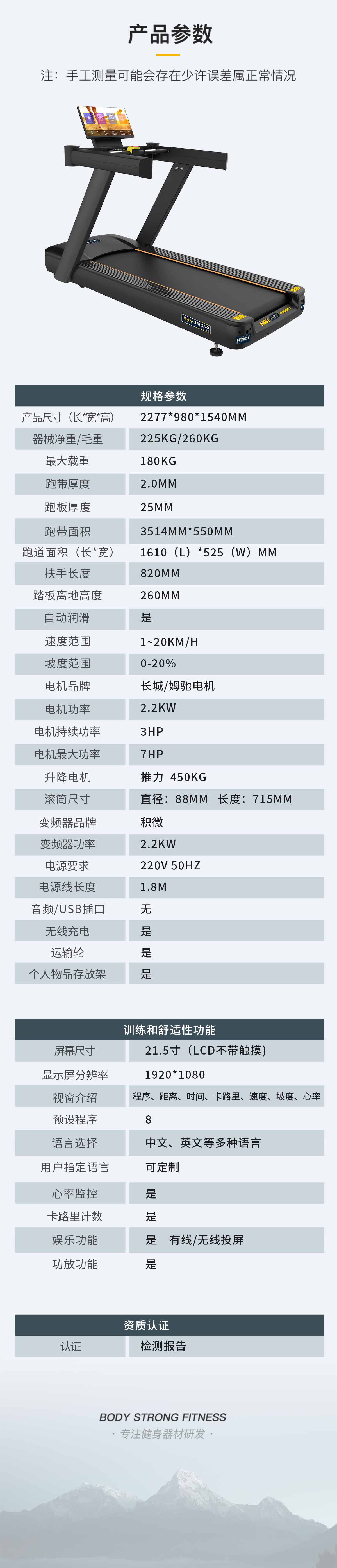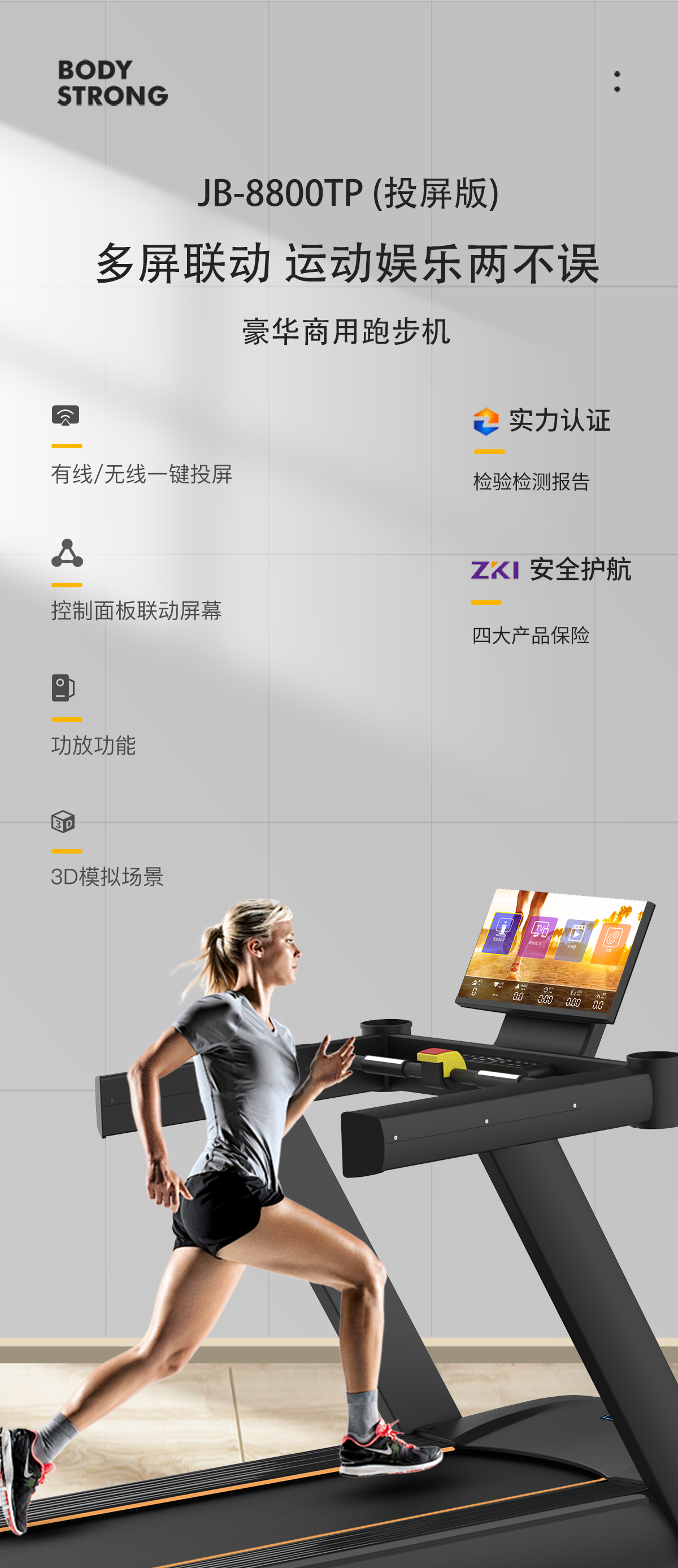 拥有四大产品保险、8种预设程序、超长跑板、无线充电、四重减震技术、自润滑功能及21.5寸LCD投屏